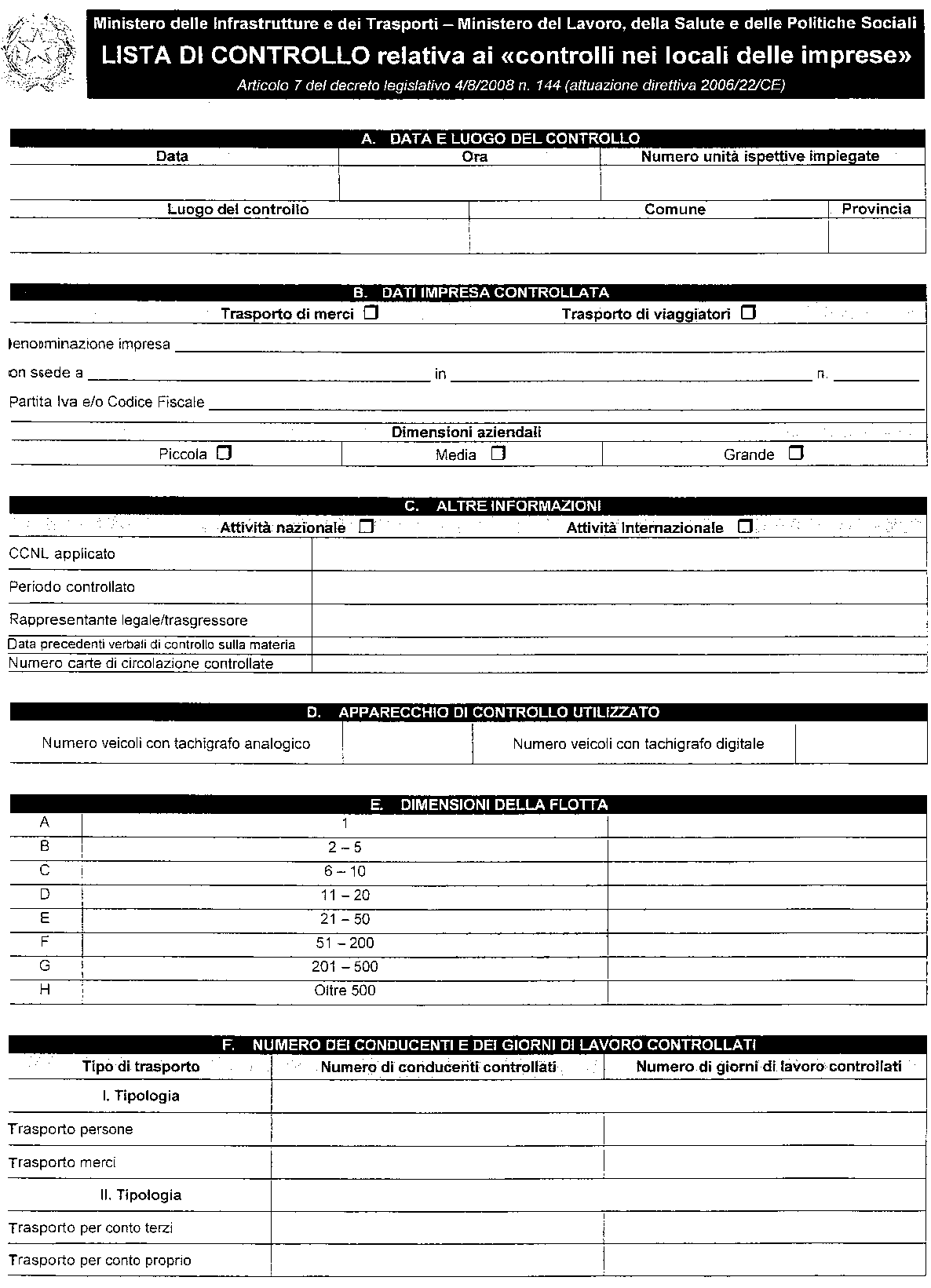 Decreto Interdirigenziale - 01/12/2008 - Modello lista di controllo per controlli nei locali delle imprese