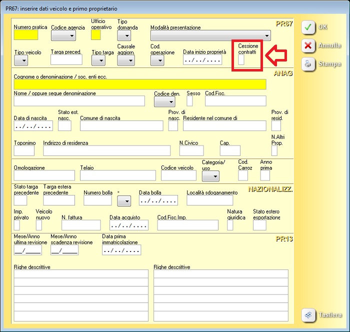 Per gestire il caso di passaggio di proprietà con cessione del relativo contratto di locazione è stato infatti inserito il nuovo campo “cessione contratti” nella maschera PR67