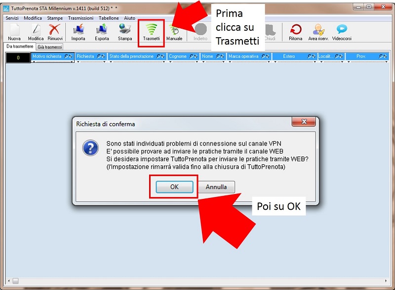 3) a questo punto, compilate la pratica da trasmettere, cliccate su Trasmetti e attendete fino al messaggio qui sotto riportato, sul quale cliccherete OK.