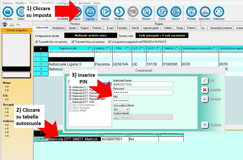 allora, per impostare il PIN, è necessario andare su SIDA Gestione, cliccare su Imposta, poi sulla tabella autoscuole e, sulla credenziale corrispondente, impostare il PIN: