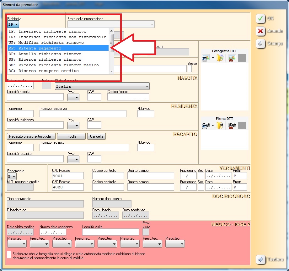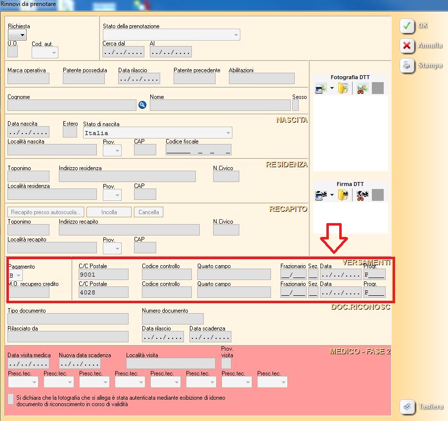 Accertarsi che sotto la voce Pagamento ci sia il Bollettino Postale (B) - Accertarsi che in Codice controllo e Quarto campo abbiate "sparato" i codici dei bollettini - Attenzione a sparare i codici giusti in linea con il 9001 e il 4028 - Compilate successivamente il CODICE TIMBRO POSTALE come indicato sotto la sezione VERSAMENTI: Frazionario poi Sezione poi Data poi Progressivo (qui sotto i bollettini da cui ricavare le informazioni). ATTENZIONE IL PROGRESSIVO HA SOLO 4 CIFRE, per cui, del numero PROGRESSIVO del bollettino Banco Posta inserite SOLO LE ULTIME 4 CIFRE.