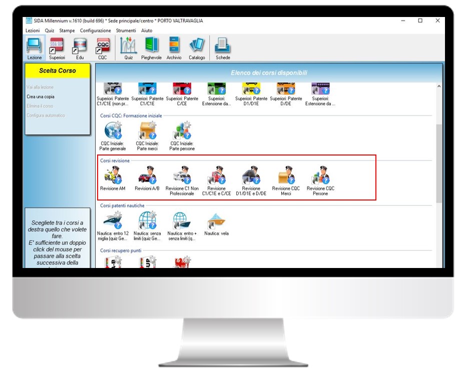 Certamente però quello delle revisioni è un servizio importante che l’Autoscuola deve offrire ai propri clienti, per questo SIDA AutoSoft Multimedia ha prontamente aggiornato i moduli AM, AB, SUPERIORI e CQC presenti nei prodotti SIDA Aula e SIDA Quiz con una sezione dedicata alla REVISIONE (Corsi revisioni). Come per il RECUPERO PUNTI, ogni patente e abilitazione interessata dal provvedimento ha il proprio corso revisione in cui sono contenuti i listati predisposti dal MIT.