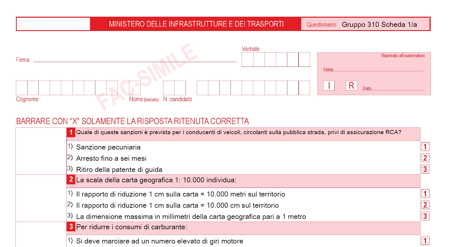 Le schede si compongono di 20 domande, ciascuna a cui va risposto indicando con 1 / 2 o 3 la risposta vera tra le tre proposte.
