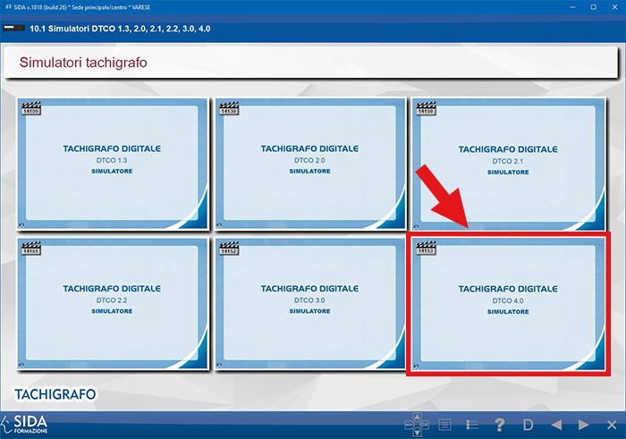 Per accedere al nuovo simulatore DTCO 4.0, cliccare sull'apposita icona in basso sullo schermo, oppure, dal menu, selezionare il capitolo 10. Simulatori e cliccare sull'animazione 14153 (Tachigrafo digitale DTCO 4.0).