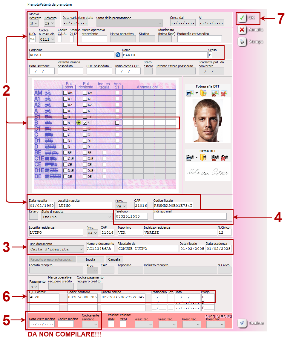 (6) Nel campo “pagamenti”, inserire almeno un bollettino 4028 da €16,00