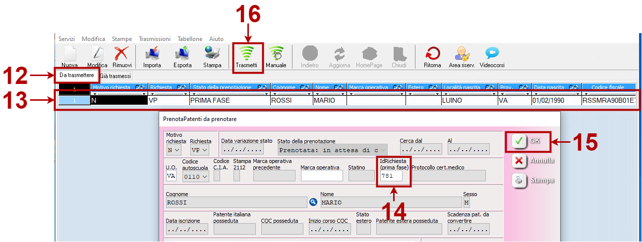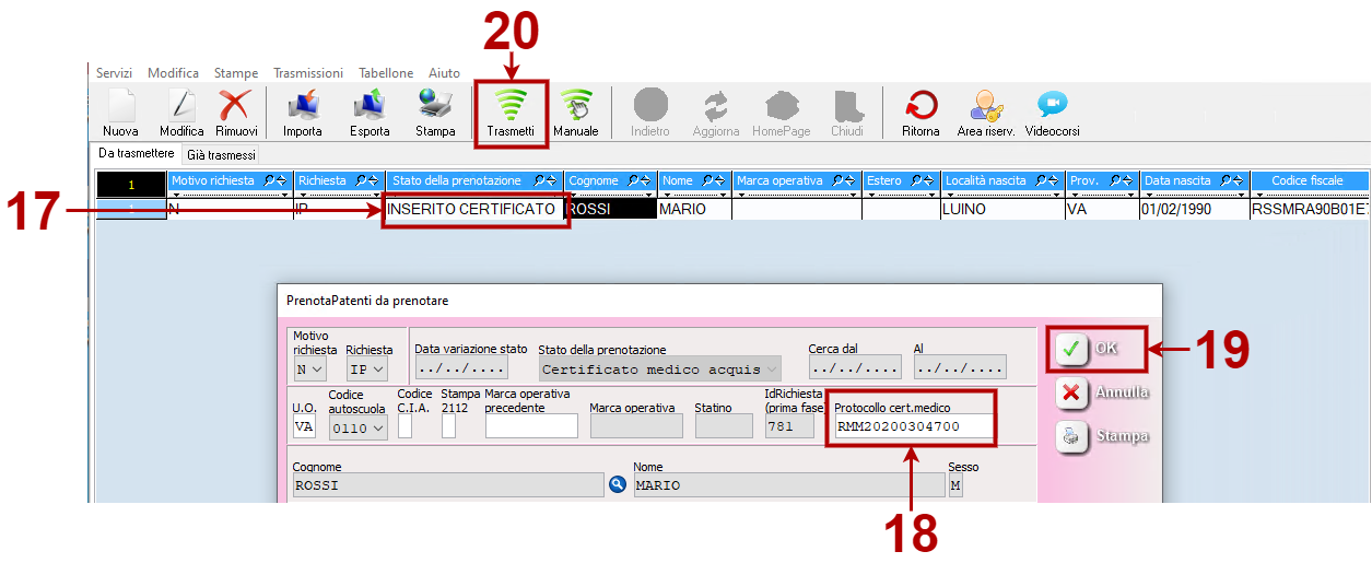 Il certificato medico è ora dematerializzato, per queste pratiche: Nella normale compilazione dei dati di queste pratiche, riceverò un codice ID (codice identificativo) che l'autoscuola dovrà dare al medico per poter fare la visita medica. Dopo la visita medica il medico darà all'autoscuola il protocollo del certificato (prot. certificato) che servirà all'autoscuola per la richiesta della marca operativa. |