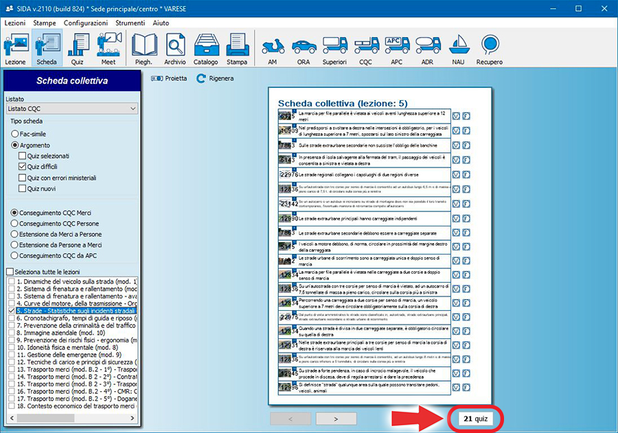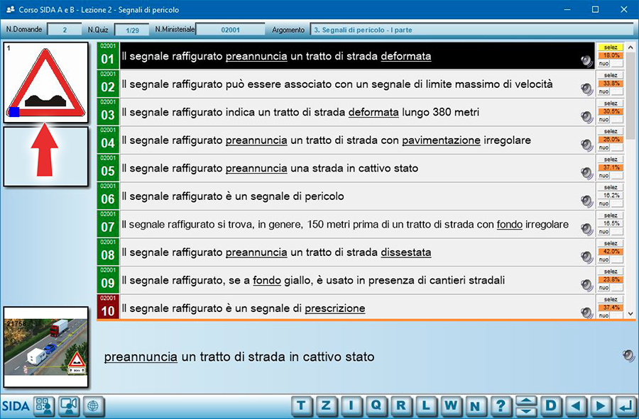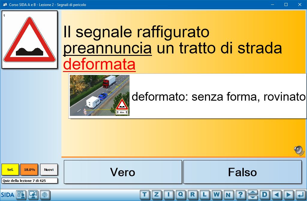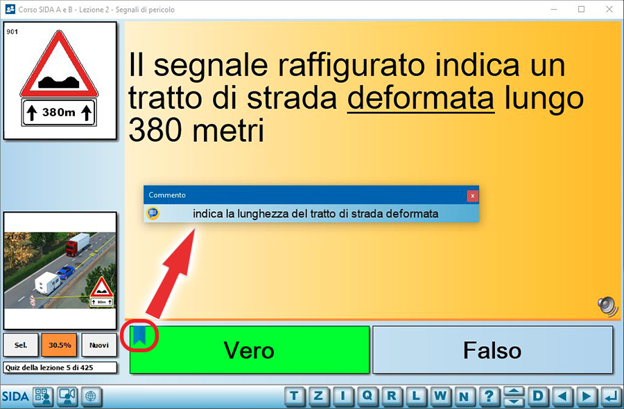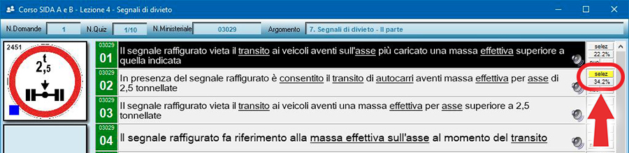 Quindi, ad esempio, in questa immagine il quiz proiettato è il numero 13 di 425 quiz totali presenti nella lezione dei segnali di pericolo.