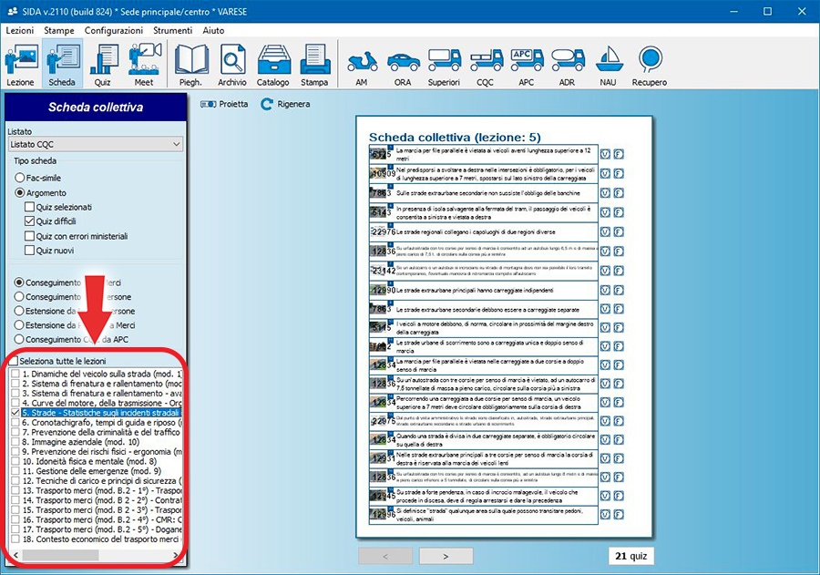La funzione Quiz permette di esercitarsi sui quiz difficili (cioè quelli mediamente più sbagliati dai candidati) selezionando gli argomenti di interesse, come rappresentato nella schermata.