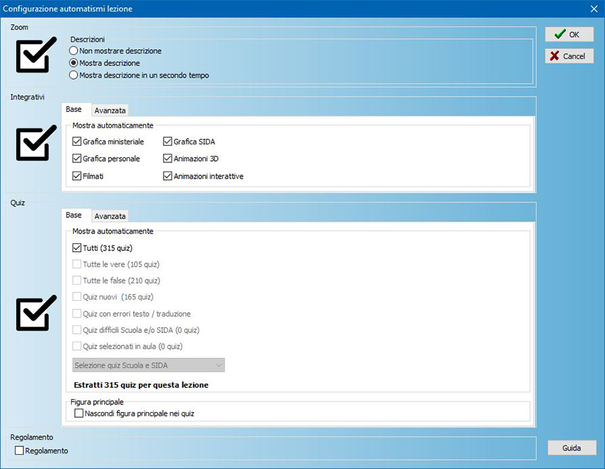SIDA Gestione permette di gestire le esercitazioni dei candidati in base alla tipologia di esame (Base oppure Vela o entrambi). E' sufficiente spuntare il corso o entrambi i corsi desiderati, nelle caselle “Corso sida x quiz”.