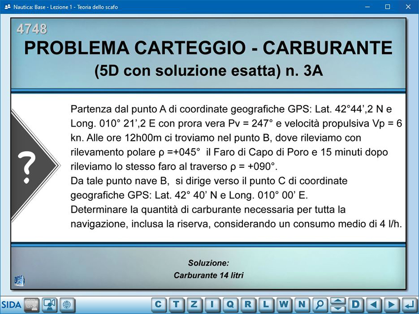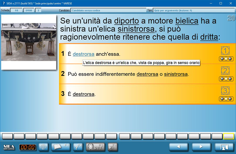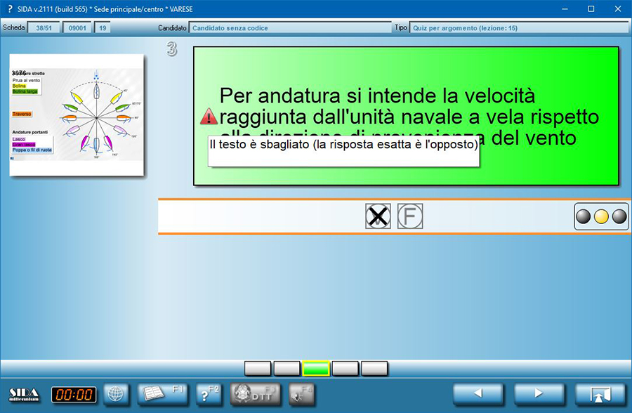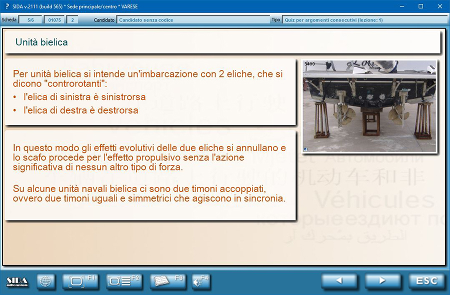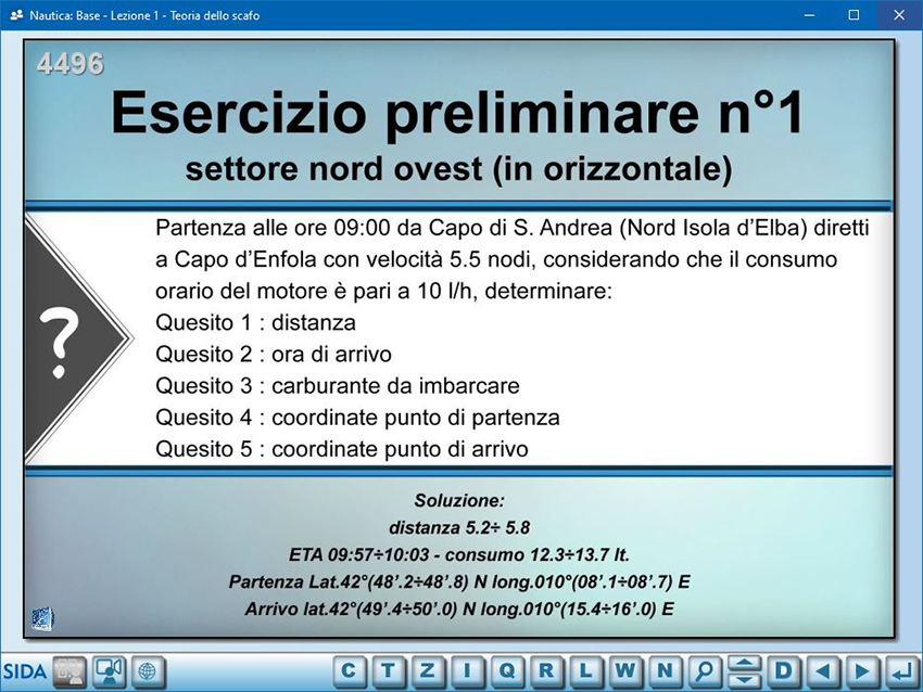 Tutte le esercitazioni (sia per la parte Base, sia per la Vela) sono complete di F1 per l’aiuto ai candidati (cliccando F1 durante la risoluzione dei quiz nei livelli 1 e 2 (teoria e quiz per autoapprendimento e quiz per argomento) appare la pagina del manuale di SIDA Nautica relativa al quiz da risolvere per aiutare il candidato.
