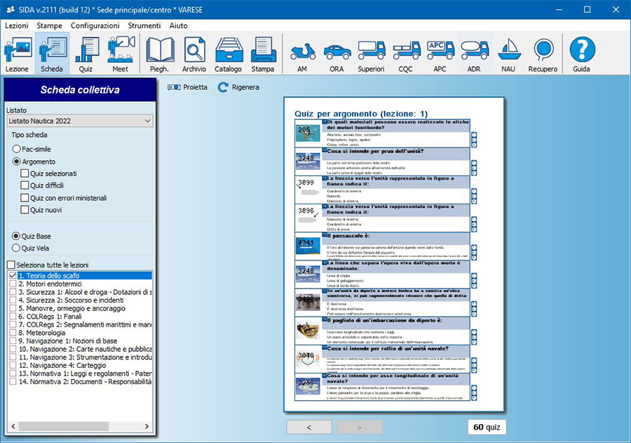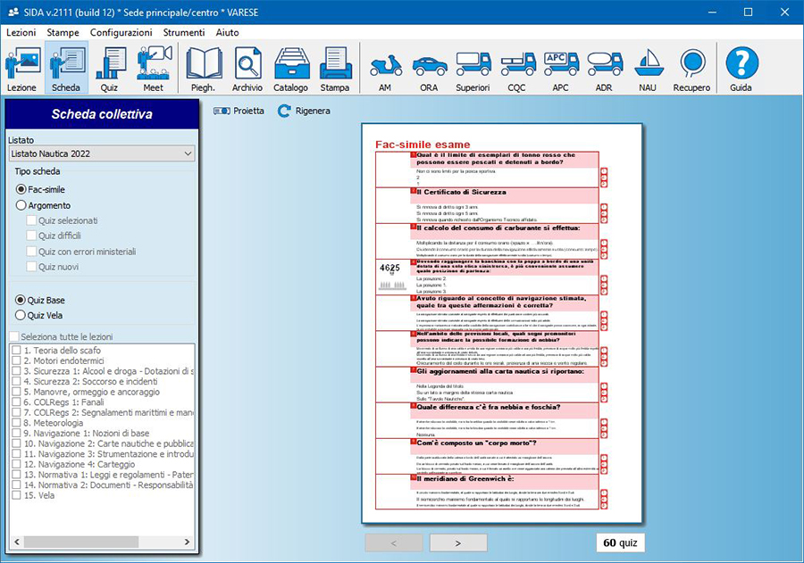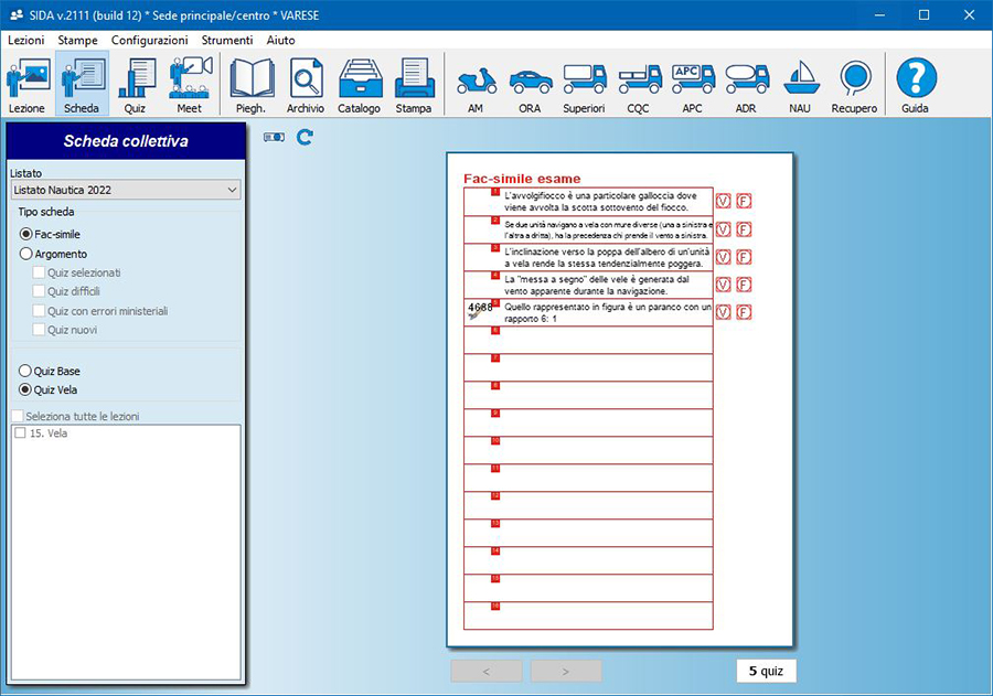che permette di svolgere, anche collettivamente, i quiz del listato base e/o vela, secondo le regole di composizione ufficiale delle schede.