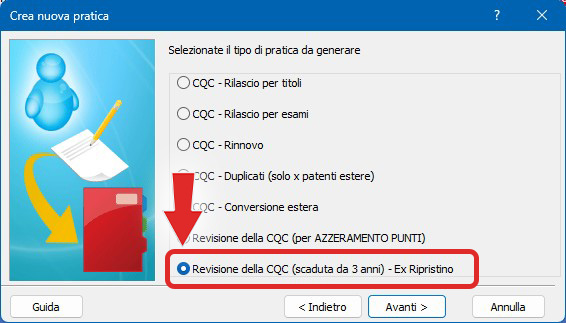 • Pratiche di Revisione CQC: è stata aggiunta la possibilità di inserire una pratica di revisione CQC a seguito di patente scaduta da più di 3 anni (ex ripristino). La pratica esistente di Revisione CQC è stata rinominata in "Revisione della CQC (per azzeramento punti)". In questo modo vengono distinte le due pratiche di revisione differenti.