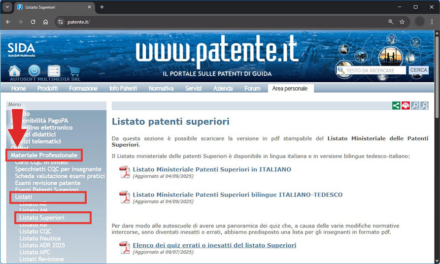 Nella Guida Rapida di SIDA SUP è stato aggiornato il materiale extra che contiene il listato ministeriale e l'elenco dei quiz che contengono errori ministeriali (questo materiale è pubblicato anche nell'area personale del sito www.patente.it).