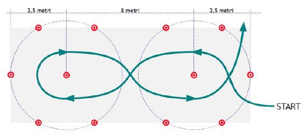 2 OTTO 2.1 Preparazione della prova Disporre due coni alla distanza di 8 m. Collocare intorno a ciascuno dei 2 coni, alla distanza di 3,5 m, altri 5 coni, in modo che le congiungenti con il cono centrale formino fra loro e con la congiungente i 2 coni, angoli di 60 gradi. Nessun cono deve essere sistemato sulla congiungente i 2 coni.